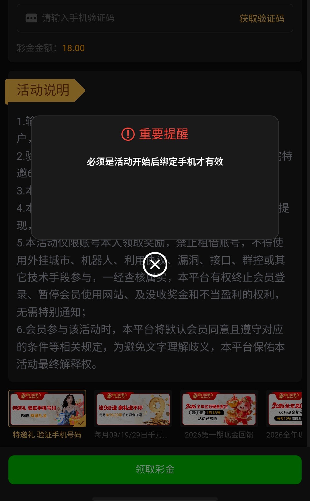 很多人 之前领不到特邀彩金的 换绑手机号码重新注册账号就能领取了