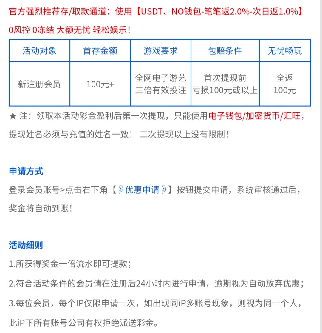 新会员包赔:新注册24小时内,会员首存100元+并完成存款的三倍或以上有效投注,首次提现前亏损100元或以上,即可申请全返本金100元包赔福利。