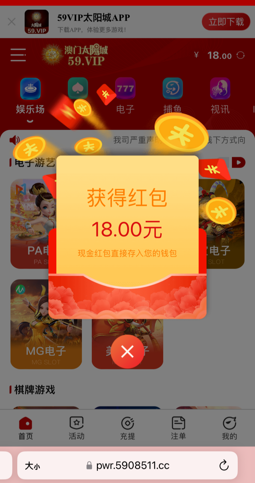 注册不用绑卡,等四五天登陆自动弹18红包,不限制游戏,一百提 今天又领到了