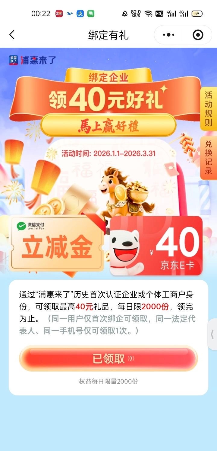 #小程序://浦惠来了/C2wZ6KfXheaXeQs 复制到微信发送出去打开 绑定自己的企业后退出去再重点一遍小程序界面选择 领取立减金,下载浦发银行开一个电子户绑到微信上 用开的时候绑的卡往电子户充值0.01,小程序搜索闪动充值40.01实付0.01再提现秒到